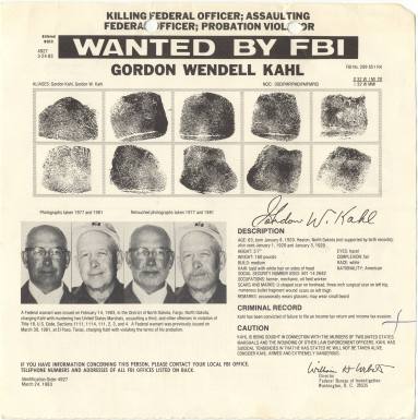 DescriptionFBI reward/wanted flyer issued 15 March 1983 for Gordon Kahl. Kahl was a federal fugitive tax protester who killed a U.S. Marshal and a Deputy U.S. Marshal in North Dakota. He was killed in a shoot out with Lawrence County, Arkansas, Police. The Lawrence County Sheriff Gene Matthews was also killed in the gun battle.Status