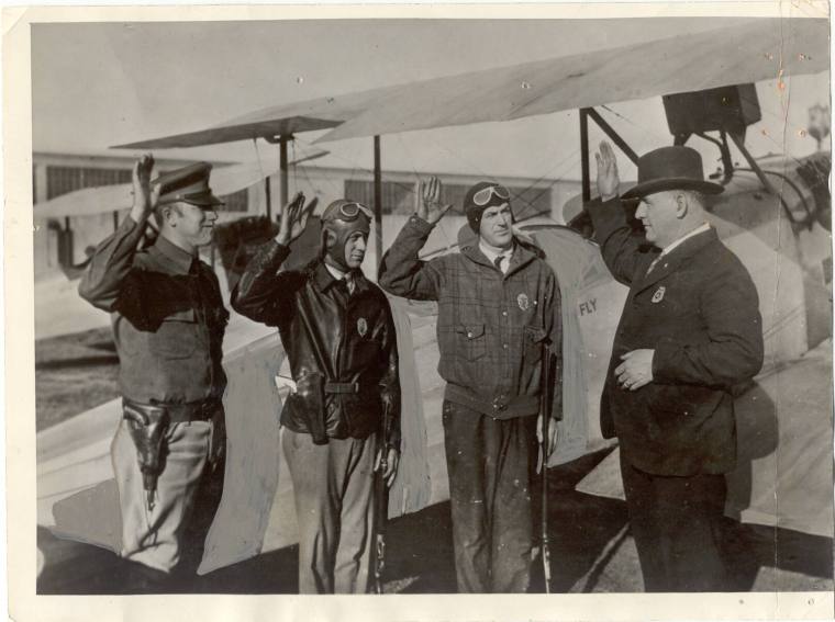 DescriptionNewswire photograph of the First Air Deputies in Arkansas (and possibly the nation). The wire note reads, "First Air Deputy Sheriffs, just appointed in Arkansas. Photo shows left to right: Lt. Smith, Army Officer, and Commercial Pilots Willard and Quinn, being sworn in by Sheriff Mike Haynie of Pulaski County, Arkansas. Their job will be to keep a vigilant watch for moonshiners and try to prevent lynchings, as far as is known they are the first Air Deputy Sheriffs in the Country."Status