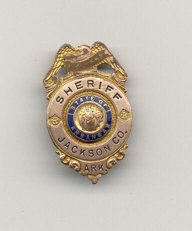 DescriptionSmall eagle atop a gold, circlular Jackson County Sheriff's Badge. It is believed to have belonged to A. Gray Albright. Albright was the 1st Commander of the Arkansas State Rangers. In the center of the badge is a blue and gold Seal for the State of Arkansas.Status