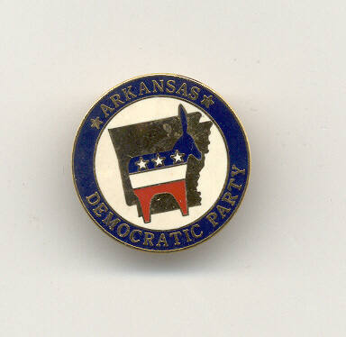 DescriptionArkansas Democratic Party Lapel Pin. Round red, white and blue pin with an image of a donkey superimposed on the state of Arkansas in the center of the pin. Gold lettering.