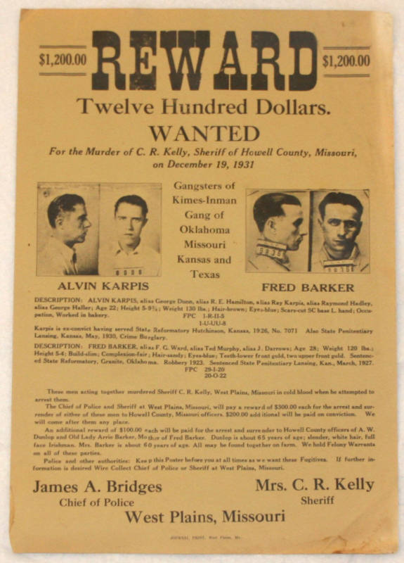 Description$1200.00 reward poster for the arrest of Alvin Karpis and Fred Barker (members of the Kimes-Inman Gang of Oklahoma, Missouri, Kansas, and Texas) for the murder of Sheriff CR Kelly of West Plains, Missouri, on December 19, 1931. Included on the poster, is a detailed physical description of each man.Status