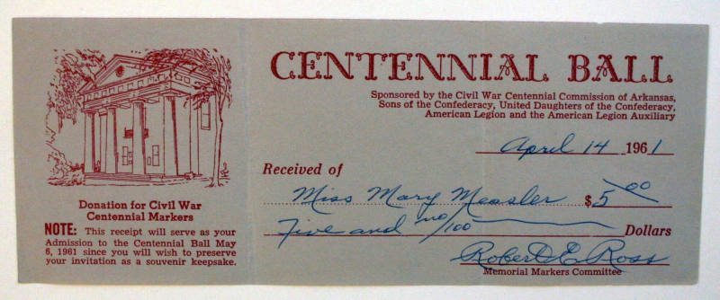 Description1961 Civil War Centennial Ball donation receipt received of Miss Mary Measler. The receipt is signed by Robert E. Ross. The invitation is printed on Grey paper in red ink. There is a picture of the Old State House Museum on upper left corner