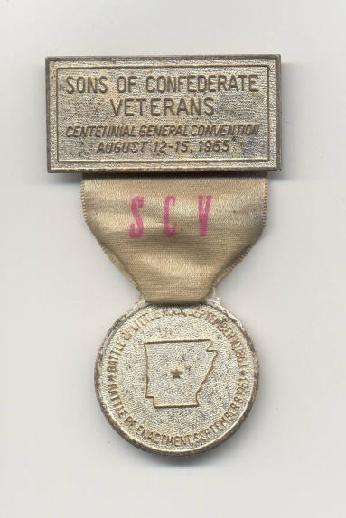 DescriptionSons of Confederate Veterans Reunion Ribbon. Red and white ribbon attached to metal pin. In gold lettering on the ribbon: "Robert C. Newton Camp No. 197 S.C.V. Little Rock, Ark. May 8-11, 1928. On the metal pin is an image of two bridges over a river.A white tag on the back of the ribbon: "Official Souvenir Badge United Confederate Veterans' Re-Union Little Rock, Ark. May 8-9-10-11, 1928 Geo. R. Wyman Little Rock, Ark. Chairman Badge Comm. Manufactured by Green Duck Company Chicago, ILL. Branches in all Principal Cities"