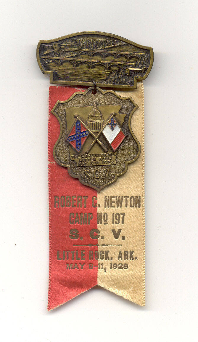 DescriptionSons of Confederate Veterans (S.C.V). Reunion Ribbon/Medallion. Red and white ribbon hanging from metal bar. Medallion hangs over the ribbon. On the metal bar is a scene of two bridges over a river. Written in gold on the ribbon: "Robert C. Newton Camp No. 197 S.C.V. Little Rock, Ark. May 8-11, 1928". Medallion is in the shape of a shield. An image of the capital with two flanking flags is imposed on an image of the state of Arkansas. Lettering: "The Wonder State Little Rock, May 8-11, 1928 S.C.V."A white tag on the back of the ribbon: "Official Souvenir Badge United Confederate Veterans' Re-Union Little Rock, Ark. May 8-9-10-11, 1928 Geo. R. Wyman Little Rock, Ark. Chairman Badge Comm. Manufactured by Green Duck Company Chicago, ILL. Branches in all Principal Cities"
