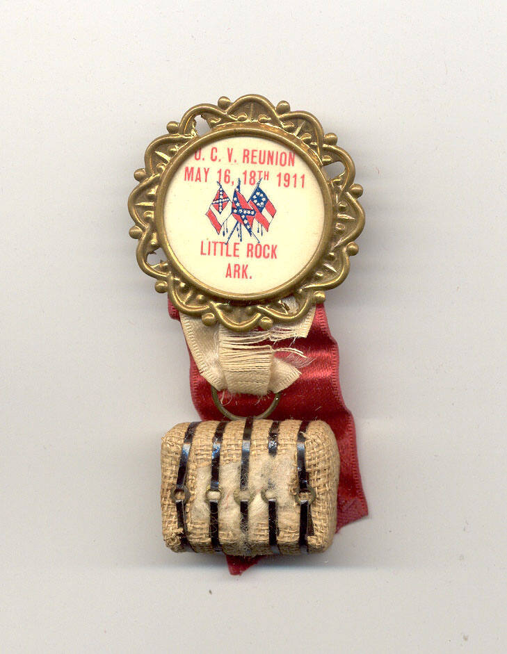DescriptionUnited Confederate Veterans Reunion Pinback from the 1911 Little Rock Reunion. The red ribbon contains a bale of cotton. The pinback is metal and enamel.Status
