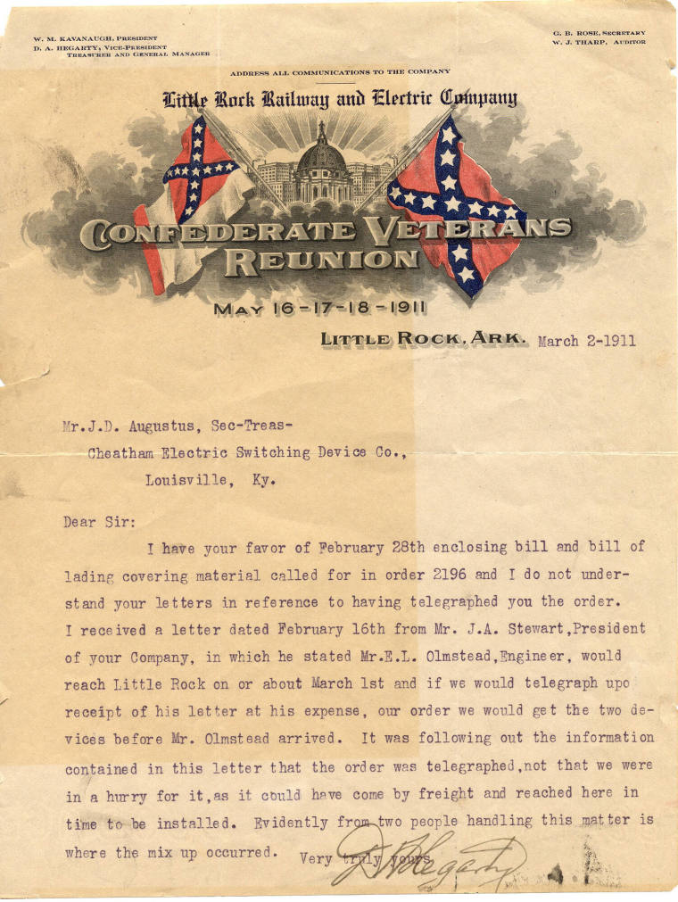 DescriptionLetter typed on 1911 Confederate Veterans Reunion Stationary. Written to Mr. J.D. Augustus in Louisville, Kentucky from D. Hegarty. Letter discusses the payment of a bill and the misunderstanding over how quickly the bill should have been paid.Status