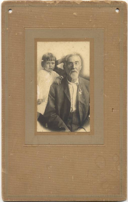 DescriptionUnited Confederate Veteran's photograph of John C. Darr and Helen Gillette, age 3. Photographer: WM. F. Uhlman, St. Joseph, MO. Written on the back: "Arkansas, Gordon's Cavalry Regt., also called 4th Regt. Cav. - Poison Springs, Mark's Mill, Price's MO Exped." John Darr was born December 6, 1833. He enlisted in the Confederacy June 20, 1862 at Dover, Arkansas in Co. I, 35th Arkansas Infantry He was discharged for disability in November, 1862. Also served in the 4th Arkansas Calvary, was a prisoner of war at Pisgah Church in Pope County, Arkansas and was confined in 1864 at Little Rock. Darr died on June 13, 1919, in Atkins, Arkansas and is buried in Darr Cemetery in Atkins.