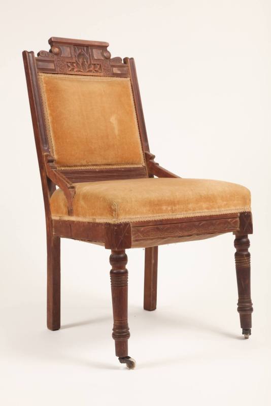 DescriptionAugustus Garland's Parlor Furniture. Chair. Ornately carved wood base, yellow velvet seat and back. Front two legs are on castors.