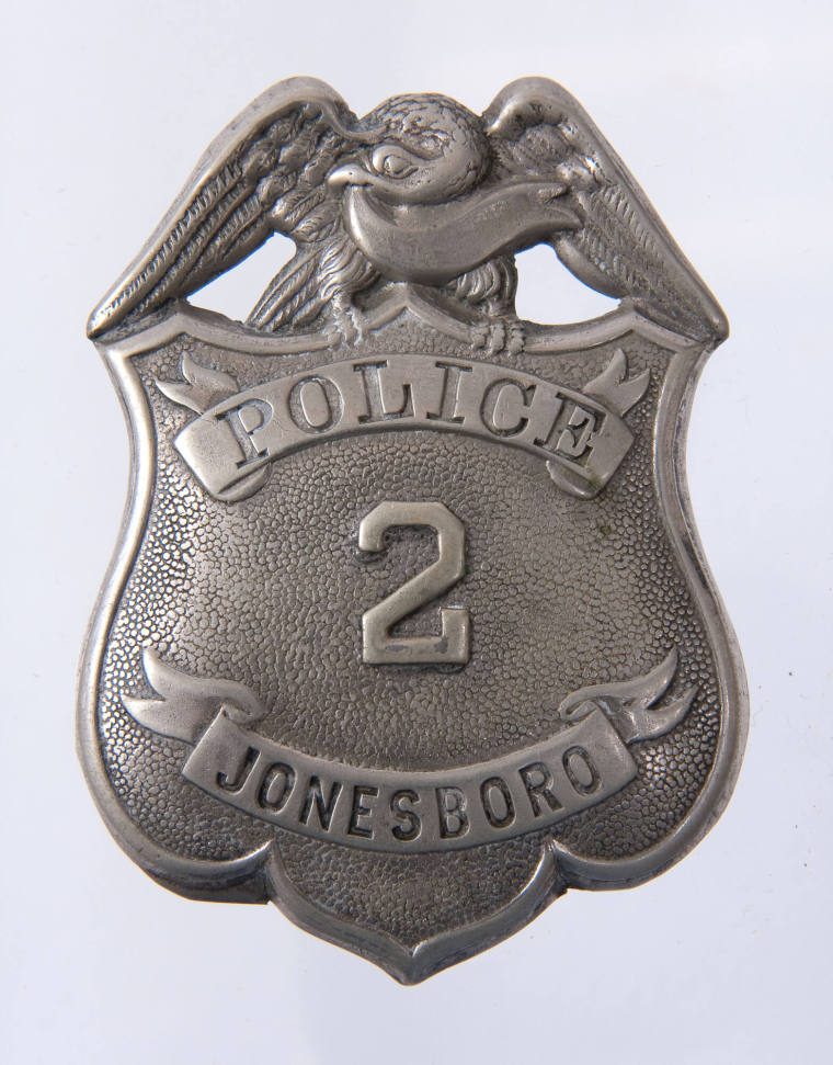 DescriptionPolice Badge. Large, silver, eagle topped shield that reads, "Police 2 Jonesboro," from Jonesboro, Arkansas.Status