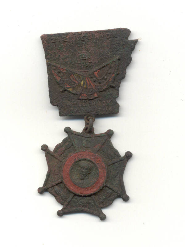 DescriptionBadge, 1911 U.C.V. Reunion. This was excavated in MacArthur Park in Little Rock, AR. The top portion is in the shape of the state of Arkansas, "21st Reunion" and the image of the state capitol with two confederate flags. The bottom is round with eight points around it. The medal is badly corroded.Status
