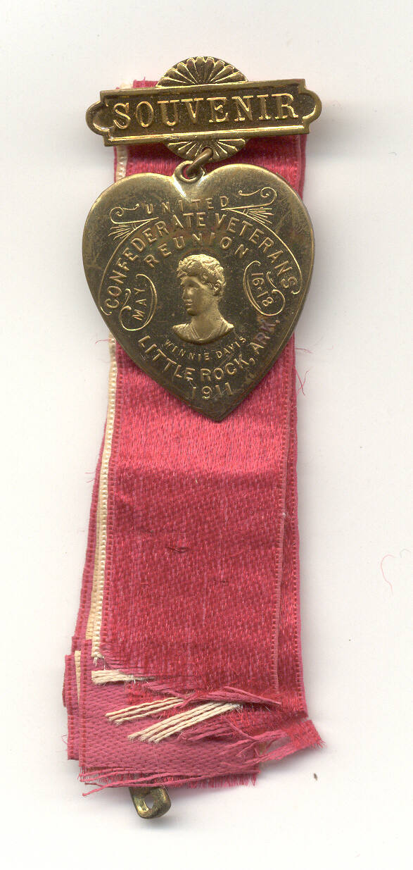 Description1949 U.C.V. Reunion medal. Heart shaped medal dangles from pin connect by red and white ribbon. On the pin: "Souvenir". In the center of the medal is an image of Winnie Davis. Around the medal: "United Confederate Veterans Reunion Little Rock 1911." At top of ribbon is a safety pin, presumably used to attach the ribbon to a jacket lapel.Status