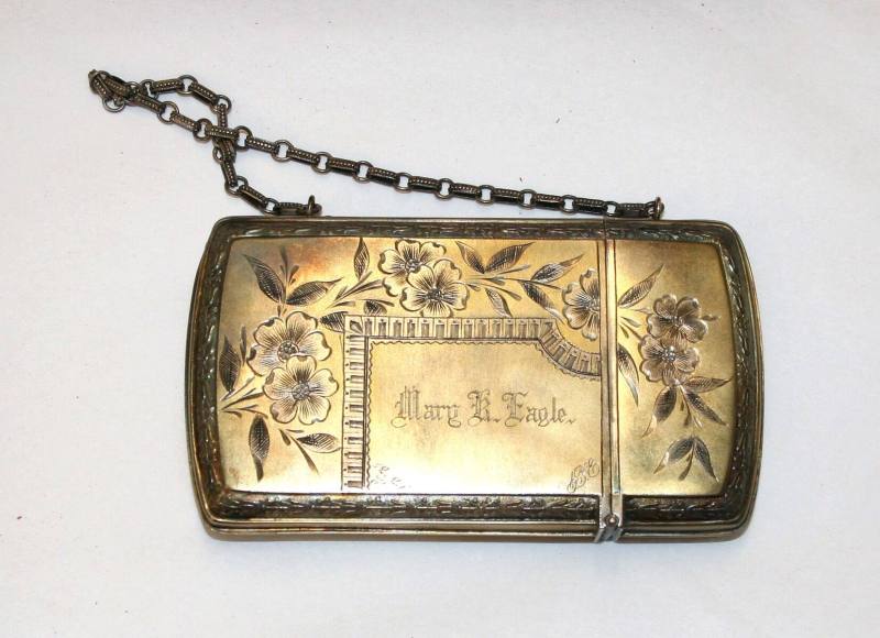 DescriptionThe sterling silver calling card case features a floral design in the Eastlake style. It is engraved "Mary K. Eagle" and "December 25, 1884". Calling cards carried in this case were used to indicate she visited someone's home.