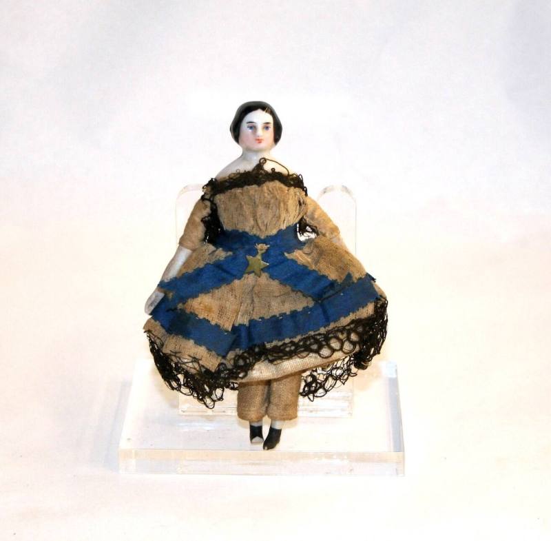 DescriptionMary Oldham Eagle’s porcelain doll, with a painted face and hair, is clothed in a beige dress with blue and black trim. A small gold star pin decorates the middle front of the dress.Status