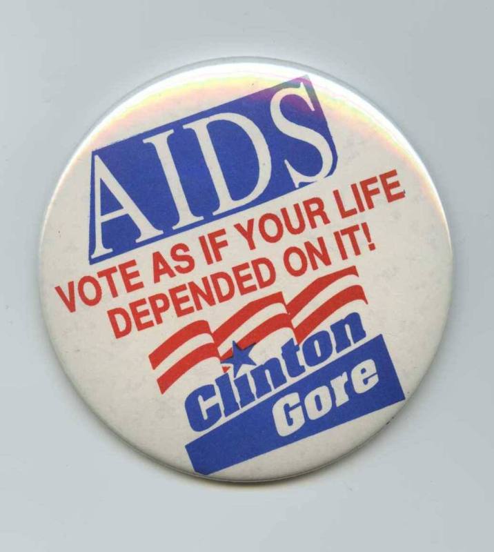 DescriptionCampaign button from Bill Clinton's 1992 Presidential bid. The button is white in color with red, white and blue lettering. At the top of the button is the word AIDS in white lettering on a blue banner. In red are the words "Vote As If Your Life Depended on It!" A red and white banner seperates the wording from the Clinton Gore logo at the bottom.