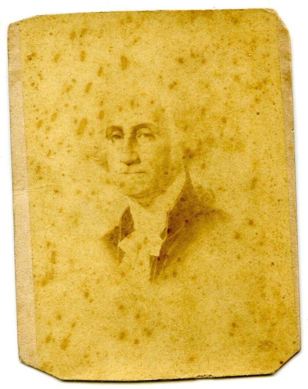 Rectangular piece of light brown card stock paper with a smaller rectangular image adhered to the front. The image depicts an oval portrait of George Washington. The corners of the CDV have been clipped.