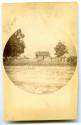 Rectangular piece of light brown card stock paper with a smaller rectangular image adhered to the front. Written on back: "House in front of which Gen. A.S. Johnson fell, Shiloh"