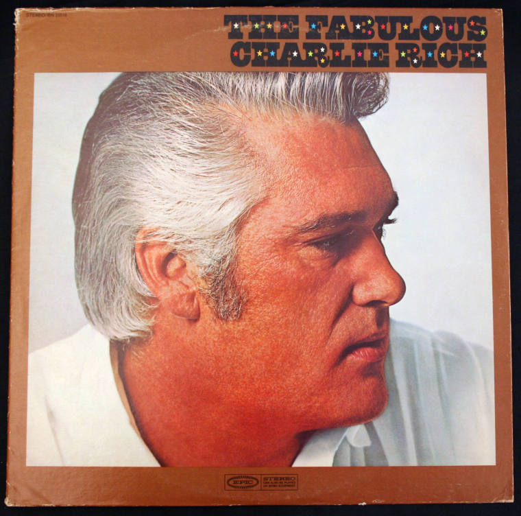 A Charlie Rich album entitled "The Fabulous Charlie Rich". The album cover features a photograph of Rich wearing a white shirt set upon a white background. The photograph is surrounded by a brown border and "The Fabulous Charlie Rich" is printed in the upper right corner and studded with multi-color diamonds. The album was produced by Epic Records.