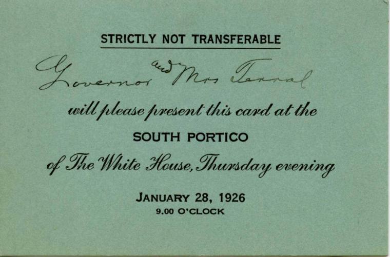 C-- Admissions card to South Portico of the White House, 28 January, 1926, 9 o'clock for Gov. and Mrs Terral. Blue in color. 2.625" x 4"