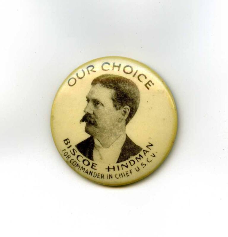 DescriptionU.S.C.V. Button. Round, cream colored with black lettering and a black & white image of Biscoe Hindman in the center. At the top of the button: "Our Choice". At the bottom of the button: "Biscoe Hindman For Commander in Chief, U.S.C.V."