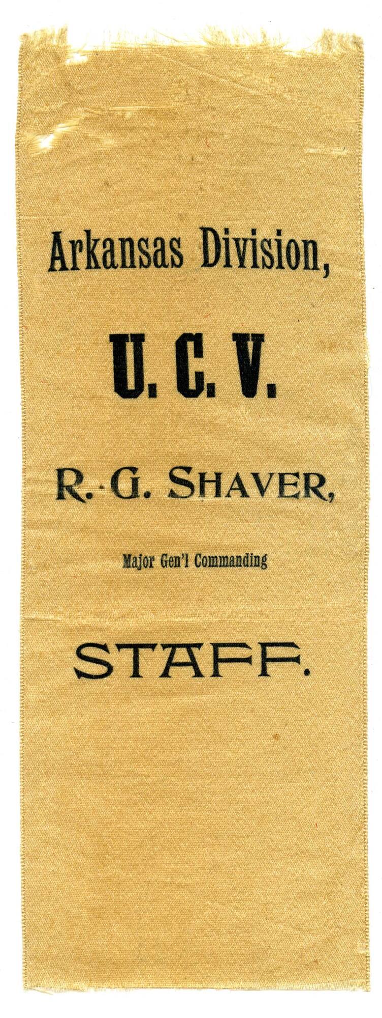 DescriptionU.C.V. Ribbon. Tan with black lettering: "Arkansas Division/U.C.V./R.G. Shaver/Major Gen'l Commanding/Staff".
