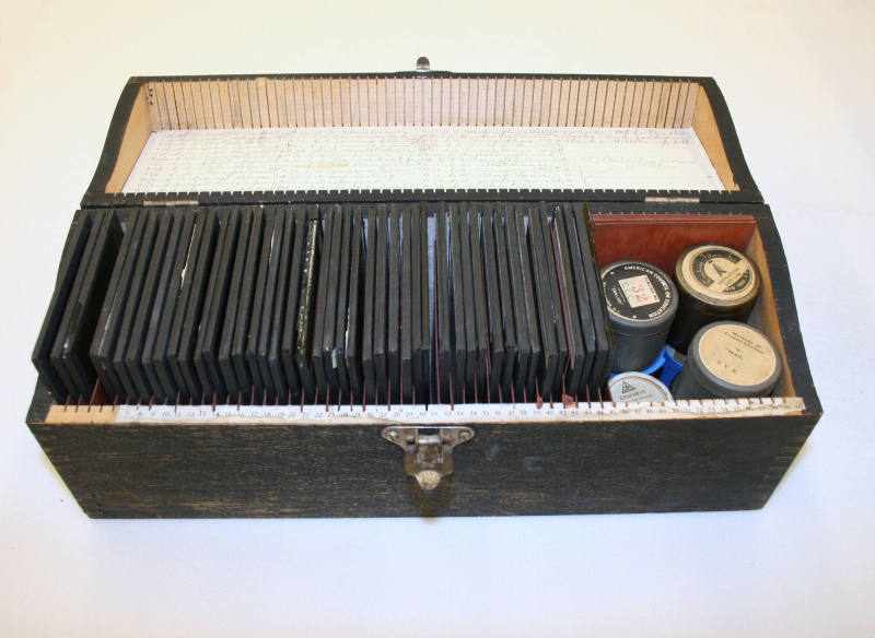 DescriptionDark brown wooden box with 44 Magic lantern glass slides from Little Rock public schools between 1910 and 1920. Also seven small canisters of film (possibly educational films). There is an incorrect index for the slides inside the top of the box (the index does not reflect what the slides really are). There is a metal latch on the front of the box.These slides appear to be part of a series of slides depicting life in Little Rock public schools between 1910 and 1920.