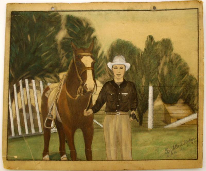 DescriptionRectangular piece of cardboard with soft pastel rendering covering all but an approximately 1" - 1/2" border. Two holes punched at upper margin of cardboard. Image depicts man wearing a white hat and holding a revolver in his left hand and the reins of a horse in the other. The chestnut horse has a white blaze down the length of its head. Horse's saddle is western in style. Horse and man are standing within a fenced pen. Rendering is signed by Albert Hodges.Status
