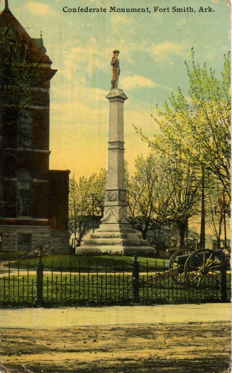 DescriptionColor postcard of the Confederate monument and cannon on the front lawn of the courthouse in Fort Smith, Arkansas. The monument was unveiled in 1903 and cost $2,750. The funds were raised by the local Varina Jefferson Davis Chapter of the U.D.C. General William Cabell was in attendance during the unveiling. The postmark is May 13, 1912 and the postcard was mailed from Earl Clickenbeard in Rich Mountain, Arkansas to William J. Clickenbeard in Jefferson City, Missouri.