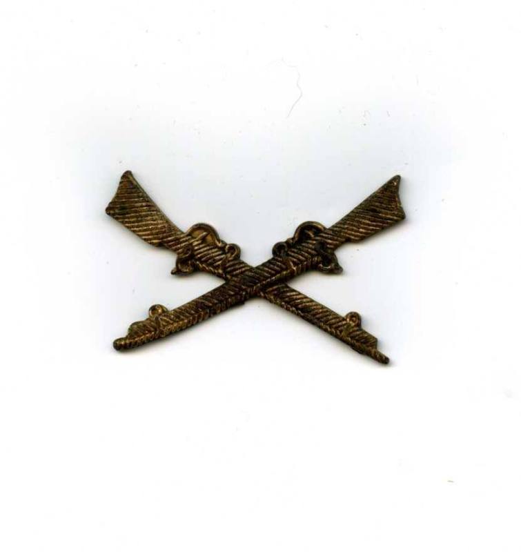 DescriptionU.S. Infantry hat pin. Crossed rifles. Dates to the Indian Wars era. Found on the grounds of the old Little Rock City Arsenal (now MacArthur Military Museum) in the 1970's.Status