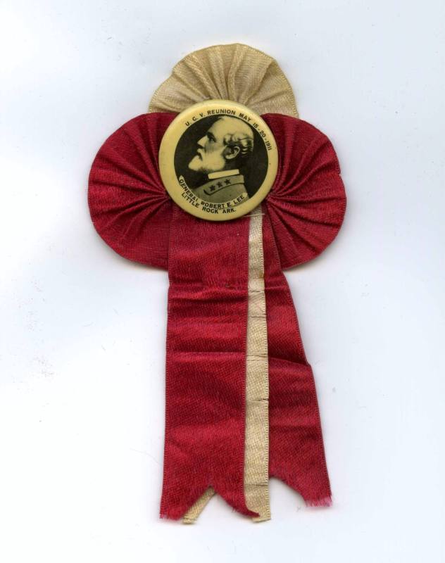 Description1911 U.C.V. Reunion badge. Round, white celluloid button attached to a tri-rosette with red and white ribbons. The button has black lettering and an image of Robert E. Lee: "U.C.V. Reunion/May 15-20,1911" and "General Robert E. Lee/Little Rock, Ark."Manufactured by Whitehead and Hoag.