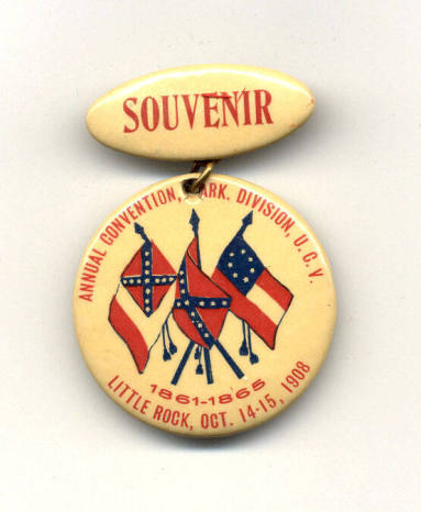Description1911 U.C.V. Arkansas State Reunion badge. Two pieces. Top portion is the pin - oval shaped with "Souvenir" in red lettering. The drop portion is a round button with "Annual Convention/Ark. Division/U.C.V." and "1861-1865/Little Rock/Oct. 14-15, 1908" in red lettering. Three crossed flags in the center of the button.Made by Whitehead & Hoag.