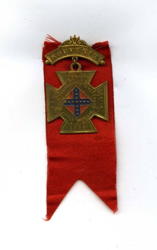 Description1911 U.C.V. Reunion souvenir badge. Red fishtail ribbon attached to a pin with a hanging cross. On the curved metal pin: "souvenir". On the cross is an enameled rebel flag with the words: "United Confederate Veterans/Little Rock, Ark." Manufactured by Schwaab.