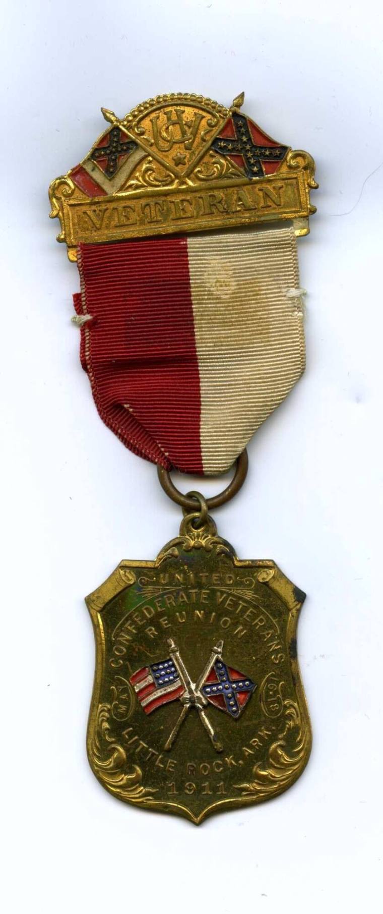 Description1911 U.C.V. Reunion Veteran's badge. Red and white ribbon attached to a pin. A shield-shaped medallion hangs from the ribbon. On the pin: "UCV/Veteran" and two rebel flags. On the medallion: "United Confederate Veterans Reunion/Little Rock, Ark./1911" and two crossed flags.Manufactured by Schwaab.
