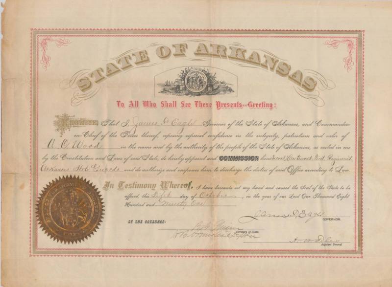 DescriptionCertificate, Governor James P. Eagle Proclamation. Eagle was a former Colonel in the 2nd Arkansas Mounted Rifles. The certificate appoints A.C. Wood as 2nd Lieutenant of the 1st Regiment of the Arkansas State Guards. These commissions were very rare.Status