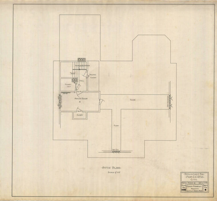 DescriptionCharles Thompson architectural drawing for C.C. Reid at 1425 Kavanaugh in Little Rock, Arkansas. Attic plan.Status