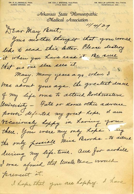 DescriptionHandwritten letter from Dr. Ida Jo Brooks to Mary Burt. The letter is written on Arkansas State Homoeopathic Medical Association letterhead,. Written in pen.11/4/29