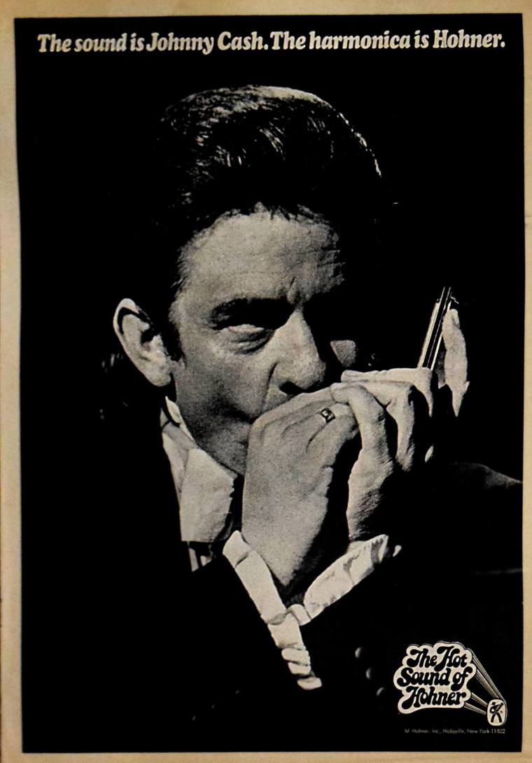 DescriptionPages from Billboard Magazine that include an advertisement for Hohner Harmonicas with Johnny Cash, and article about Johnny Cash's family and a Johnny Cash discography. Black and white.
