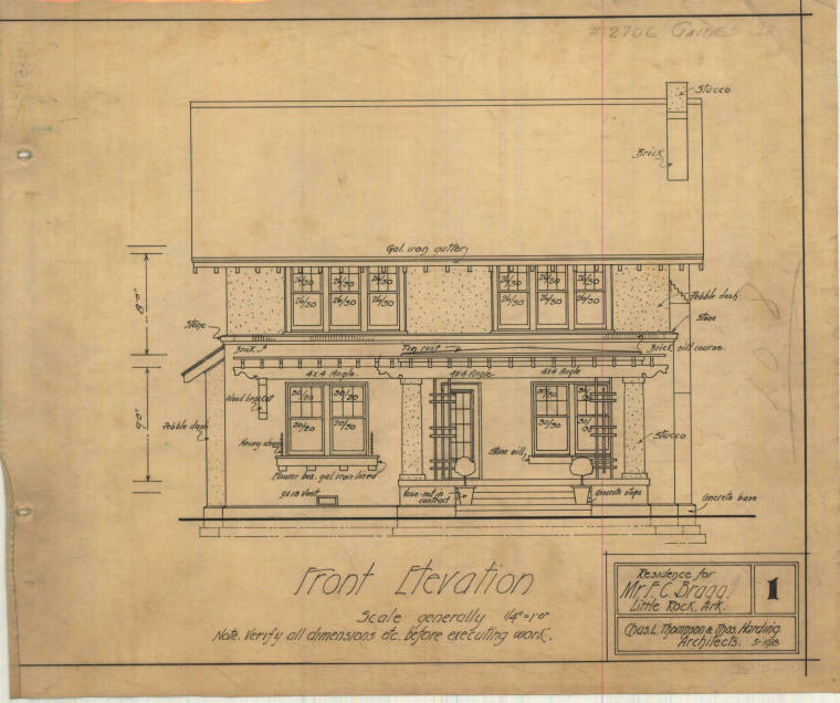 DescriptionCharles Thompson architectural drawing for F.C. Bragg at 2704 Gaines St. in Little Rock, Arkansas. Front elevation.Status