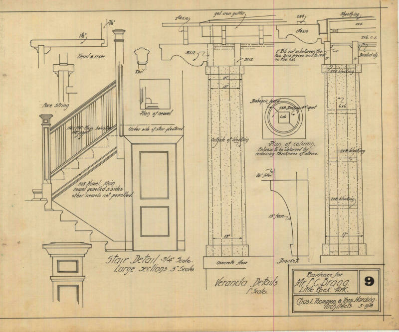 DescriptionCharles Thompson architectural drawing for F.C. Bragg at 2704 Gaines St. in Little Rock, Arkansas. Details of stairs, veranda, columns.Status