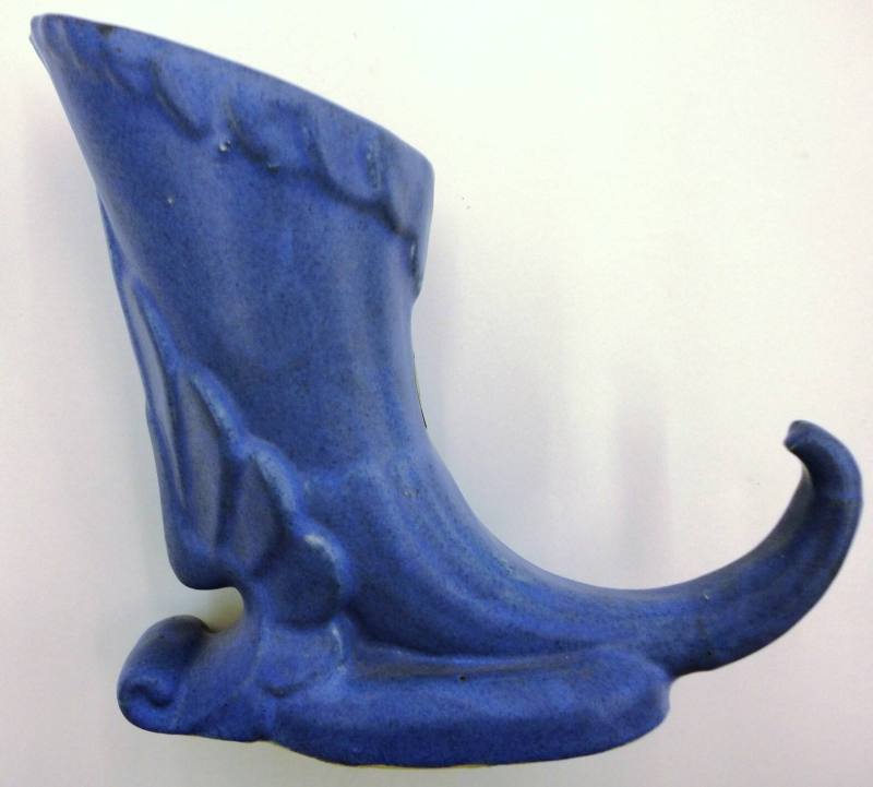 DescriptionVase made by Niloak Pottery in Benton, Arkansas.Blue, glazed cornucopia. Metallic "Potteries" sticker on the inside curve. Niloak low relief mark is glazed over.