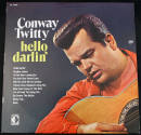 Description"Hello Darlin'" Album cover shows a color picture of Twitty playing the guitar. Photo is from the shoulders up and is in the right corner of the cover. Twitty is wearing an orange mock-turtleneck. The background of the cover is black and the title and song list are across the left side in yellow and white lettering. Album was produced in 1970 by Decca Records.