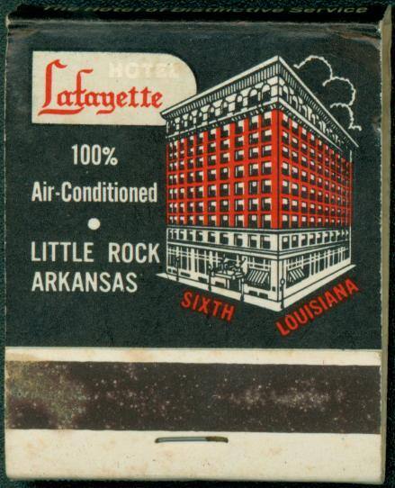 DescriptionMatchbook advertising the Lafayette Hotel at the corner of 6th and Louisiana. Front flap features image of hotel in red and white against a black background and emphasizes that the hotel is "100% Air-conditioned." Back flap features a circular drawing of Lafayette and red and white text against a black background. It stresses the 300 comfortable rooms and baths. famous for good eating and garage facilities. All the matches are in the book. (See file for image)