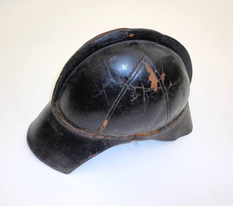 DescriptionHelmet from the Little Rock Fire Department. Dark leather. Raised crown ridge with short front bill and long back bill. Design on both temples: two pairs of impressed parallel lines, each running diagonally towards the crest to form a narrow chevron-like device. Brown cloth sweatband.