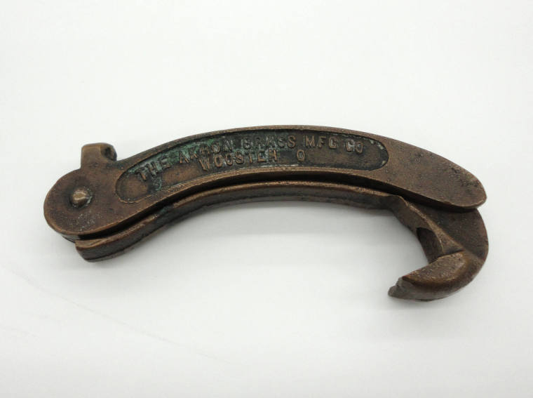 DescriptionLittle Rock Fire Department spanner wrench. Made by The Akron Brass Manufacturing Co. of Wooster, Ohio. S-curved with one hooked end nesting into slotted end like a pocket knife. Forms two crescents when folded. Used to tighten fire hose settings.