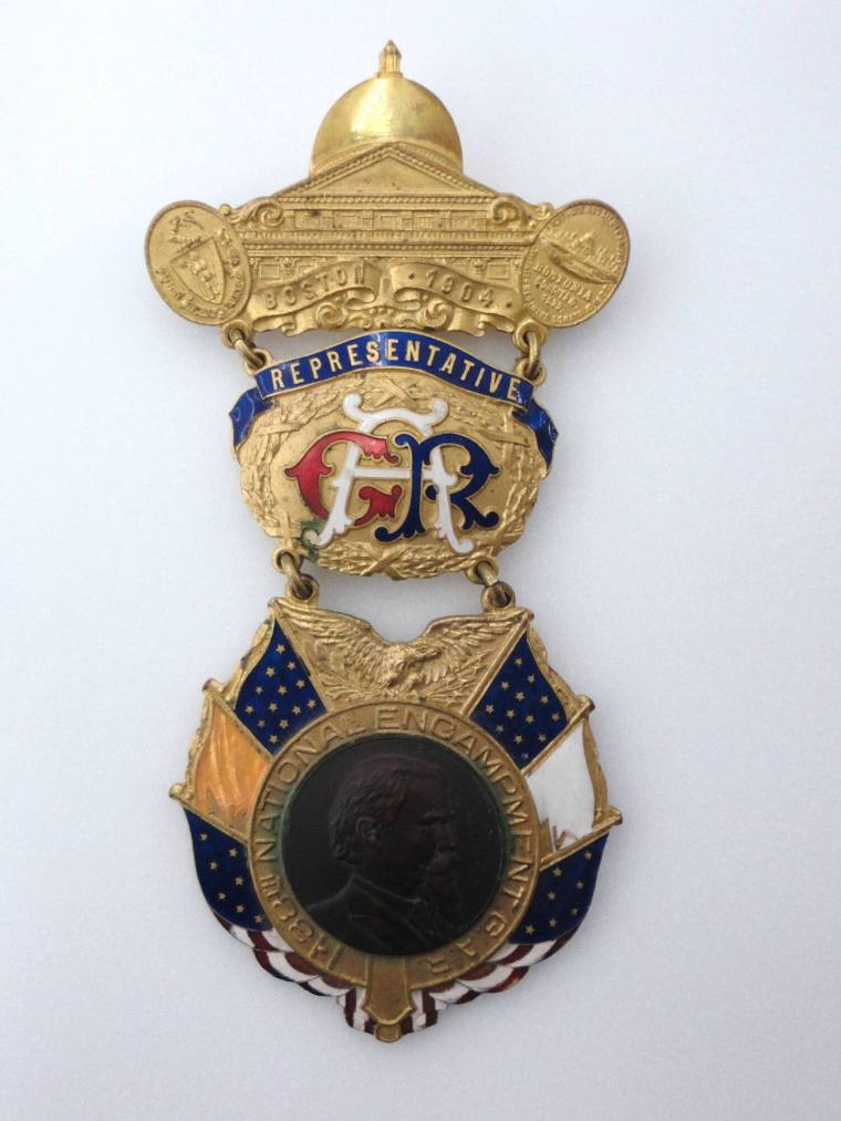 DescriptionBadge from the Grand Army of the Republic. The Grand Army of the Republic was a society for Union veterans.The top tier is a pin in the shape of a building with two official seals on both sides of the building. At the bottom of the building: "Boston/1904". The second tier is round with "GAR" in red, white and blue letters. At the top: "Representative". A medallion hangs from the second tier. In the middle of the medallion is a raised relief image of a man. Around the image: "38th National Encampment G.A.R."