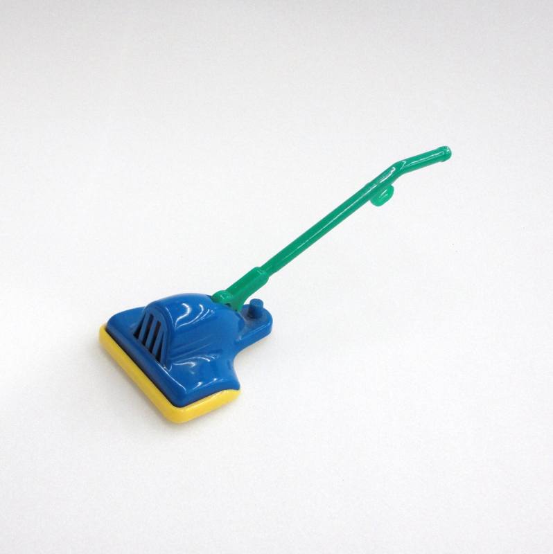 DescriptionMiniature toy vacuum cleaner. Green handle with blue and yellow body. Red roller on the bottom; roller moves.Status