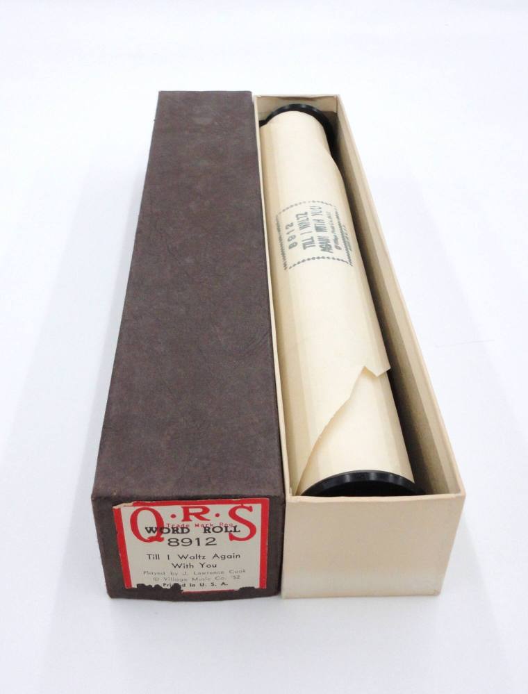 DescriptionPlayer piano roll, "Till I Waltz With You Again". Goes with Faubus player piano (2011.031.01). Played by J. Lawrence Cook. Brown box with music roll. On one end of the box is a white label with red and black print.Status