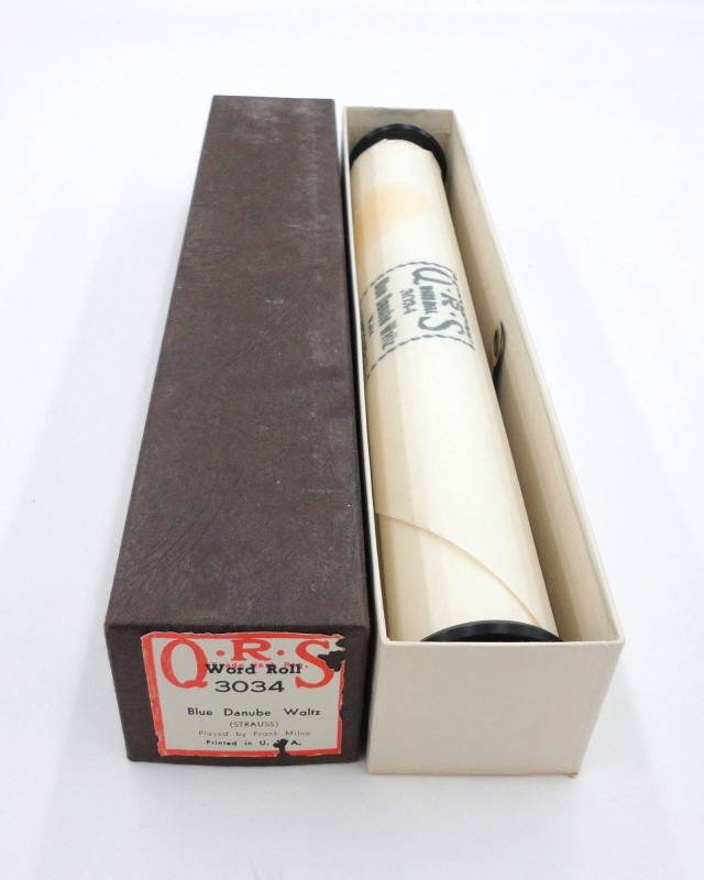 DescriptionPlayer piano roll, "Blue Danube Waltz". Goes with Faubus player piano (2011.031.01). Played by Frank Milne. Brown box with music roll. On one end of the box is a white label with red and black print.Status