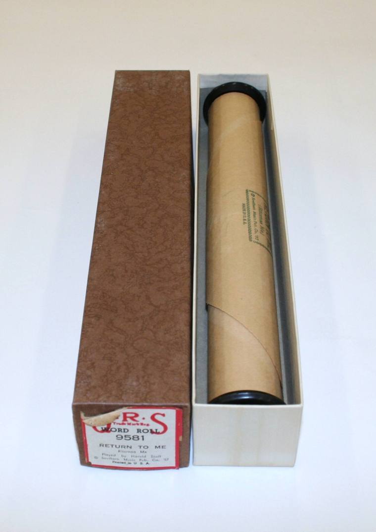 DescriptionPlayer piano roll, "Return to Me". Goes with Faubus player piano (2011.031.01). Played by Harold Scott. Brown box with music roll. On one end of the box is a white label with red and black print.Status