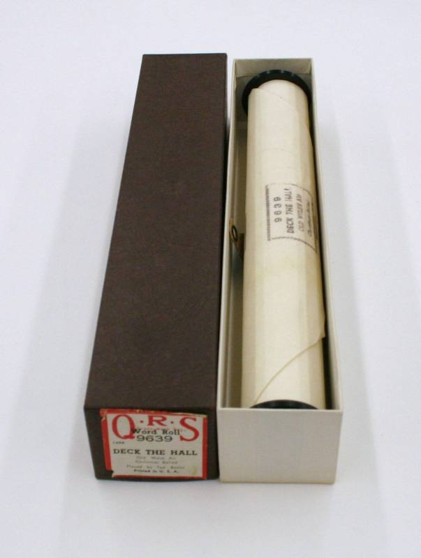 DescriptionPlayer piano roll, "Deck the Hall". Goes with Faubus player piano (2011.031.01). Played by Ted Baxter. Brown box with music roll. On one end of the box is a white label with red and black print.Status