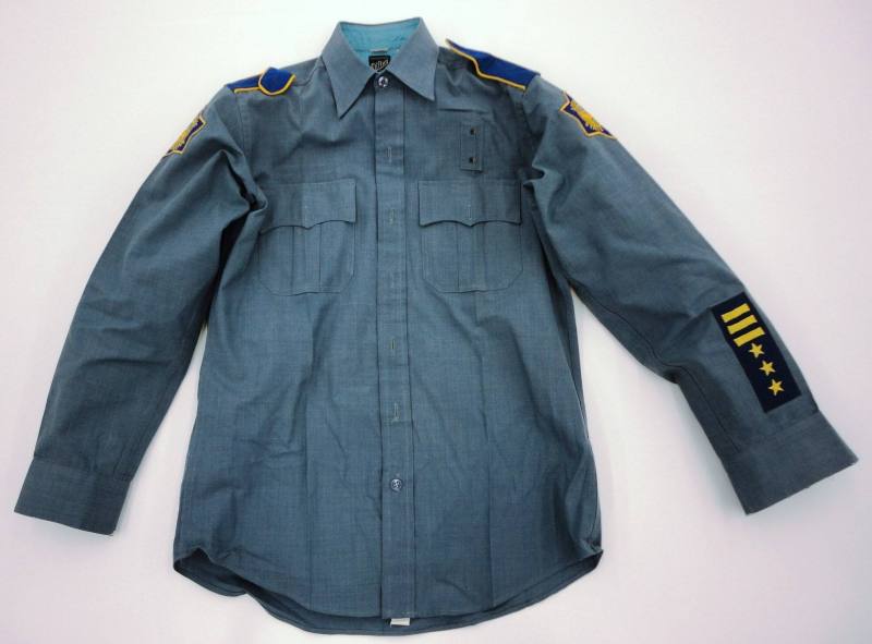DescriptionArkansas State Police uniform shirt belonging to Win Phillips. Blue.